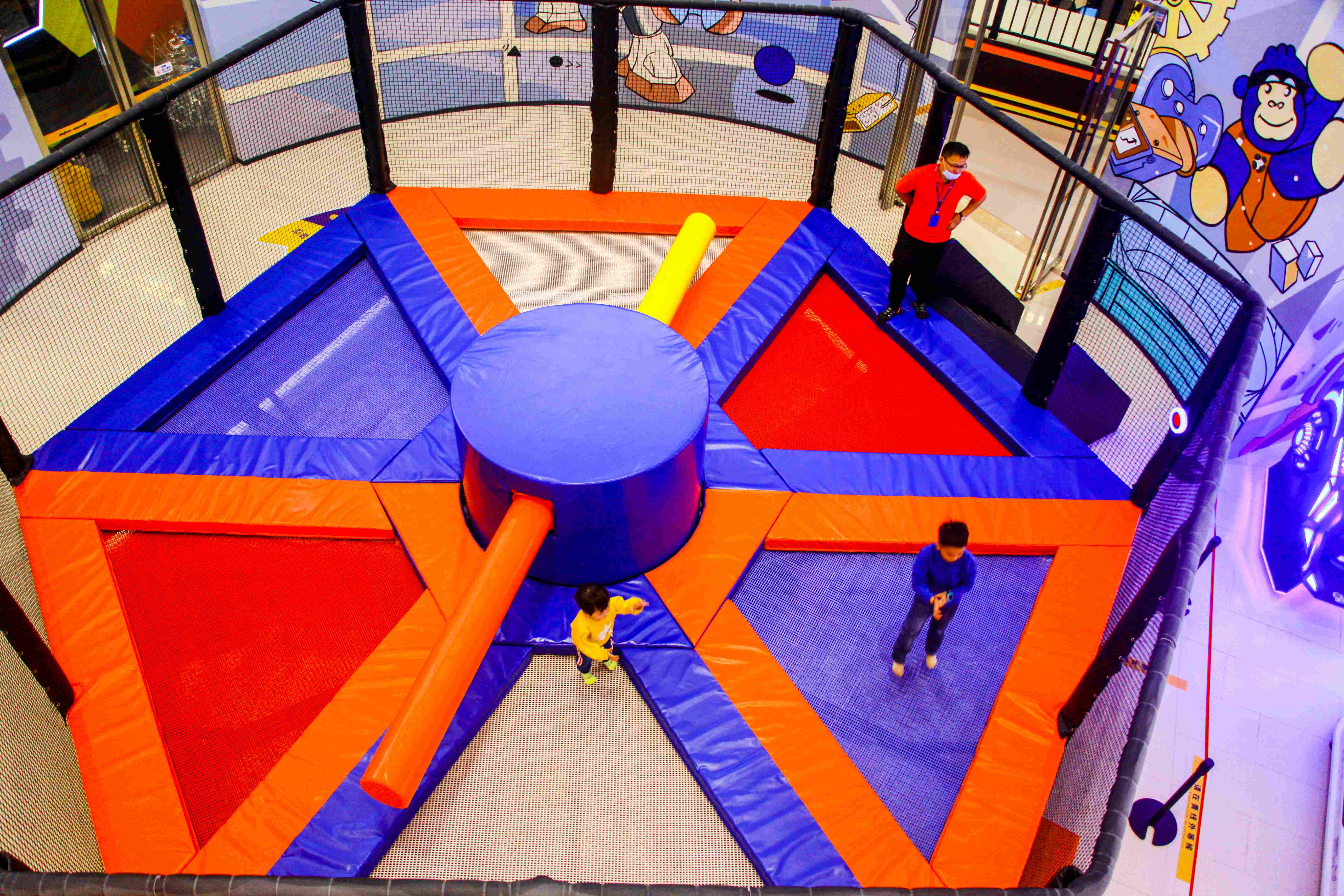 核心地標(180㎡):星際母艦探索基地。一座充滿機械感和燈光元素的淘氣堡定制結構,集成指揮臺滑梯、管道逃生艙、光電操控面板。