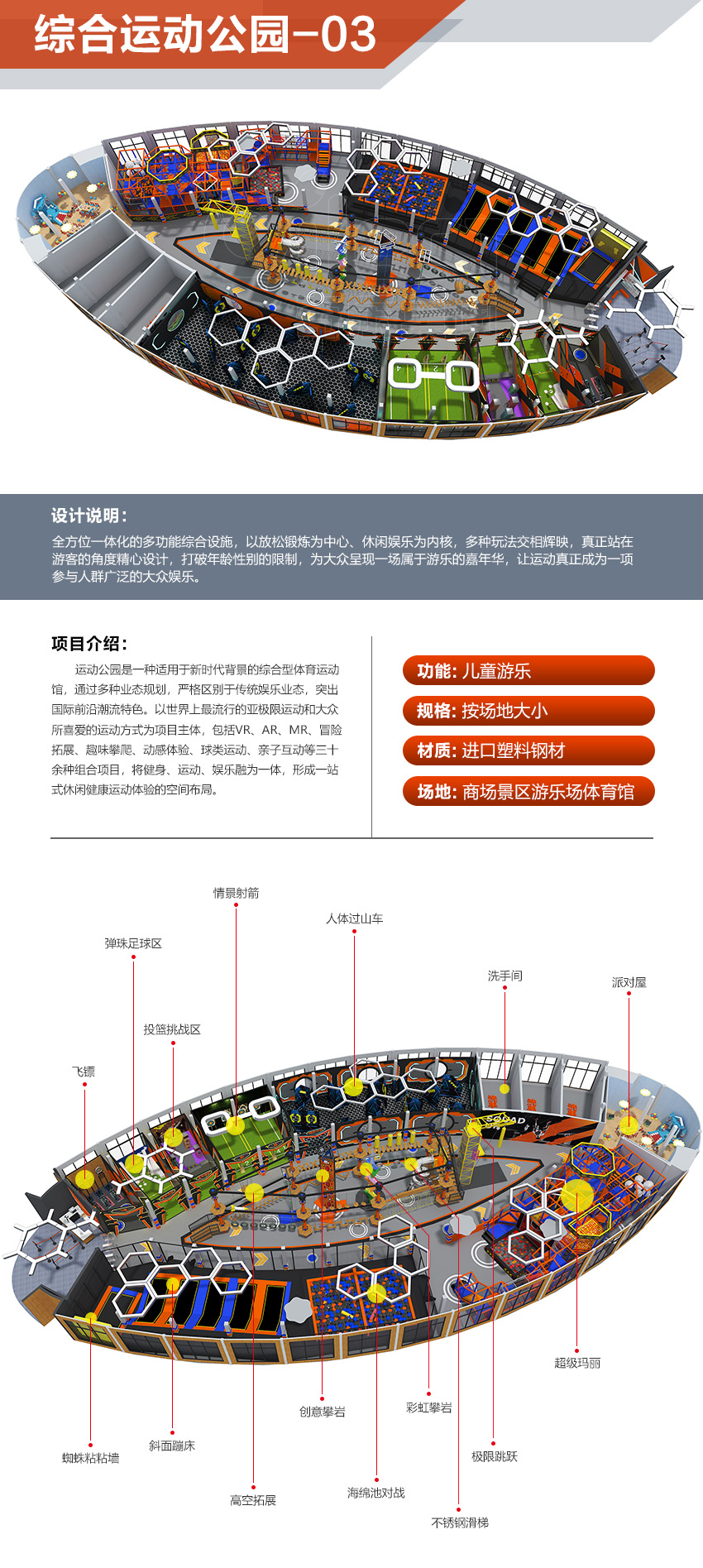 本項目適用于各種親子主題類的樂園,巧妙運用“熊貓”IP造型設(shè)計,集拓展、探險、滑道、飛索、蹦極、不銹鋼滑梯、攀巖、爬網(wǎng)等46種不同運動體驗的文化主題項目,結(jié)合“大灰熊”IP形象,融入相關(guān)設(shè)計元素,打造差異化的網(wǎng)紅IP主題性運動拓展?fàn)I地綜合體。